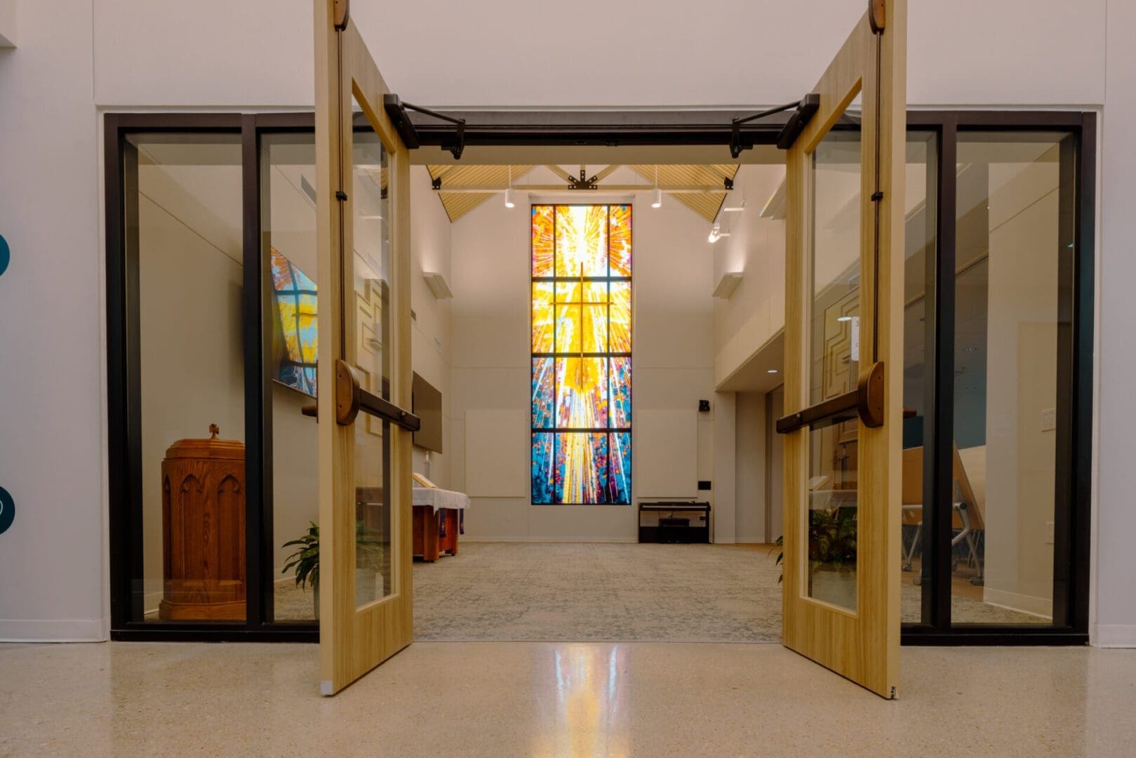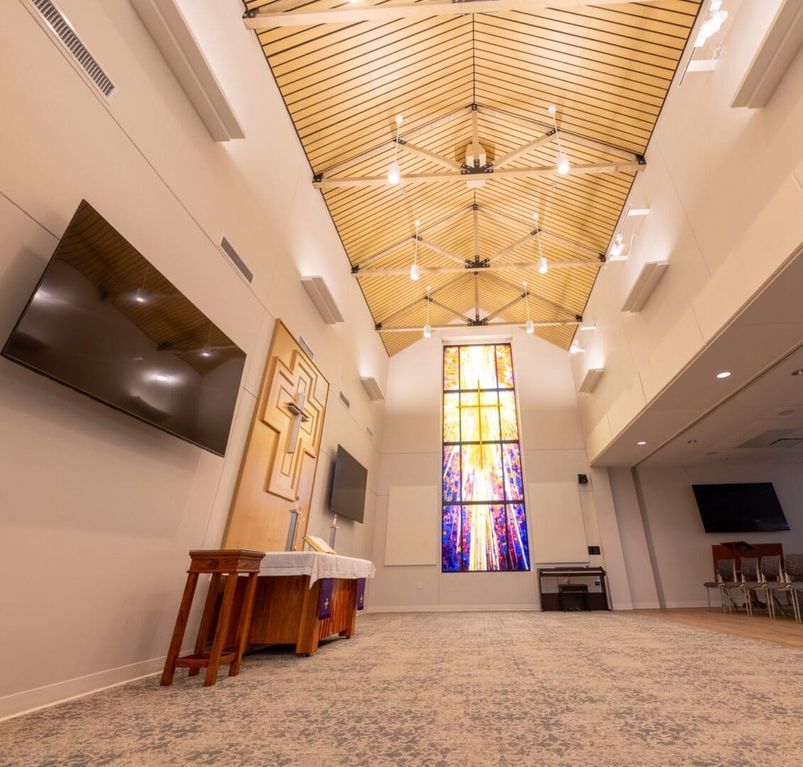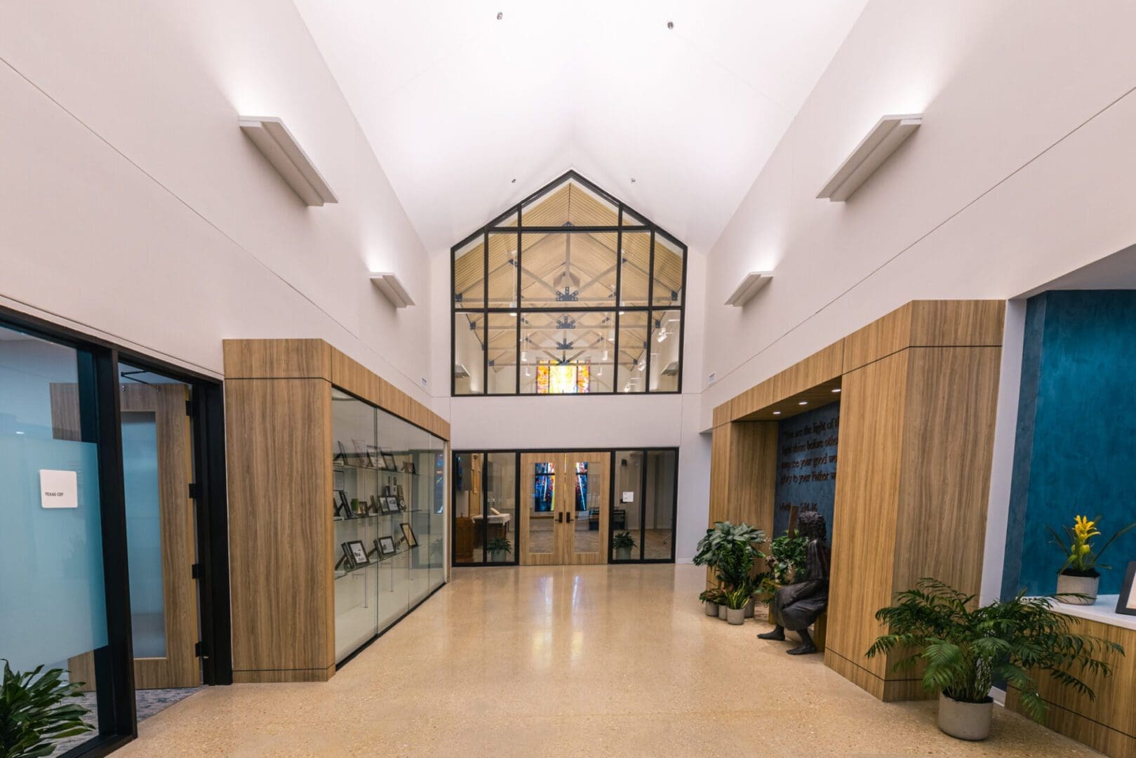 The new Texas District Mission Support Center is located in north Round Rock. The 15,000 square foot single-story structure is clad in Texas Limestone and plaster, with a standing seam metal roof and corresponding over-window canopies. The building houses three major departments within the Texas District of The Lutheran Church, and also includes a Chapel and two Large Meeting Rooms. The prominent feature of the building is a large stained glass window depicting “Christ – the Light of the World” as designed by I H S Studios of Fredericksburg.