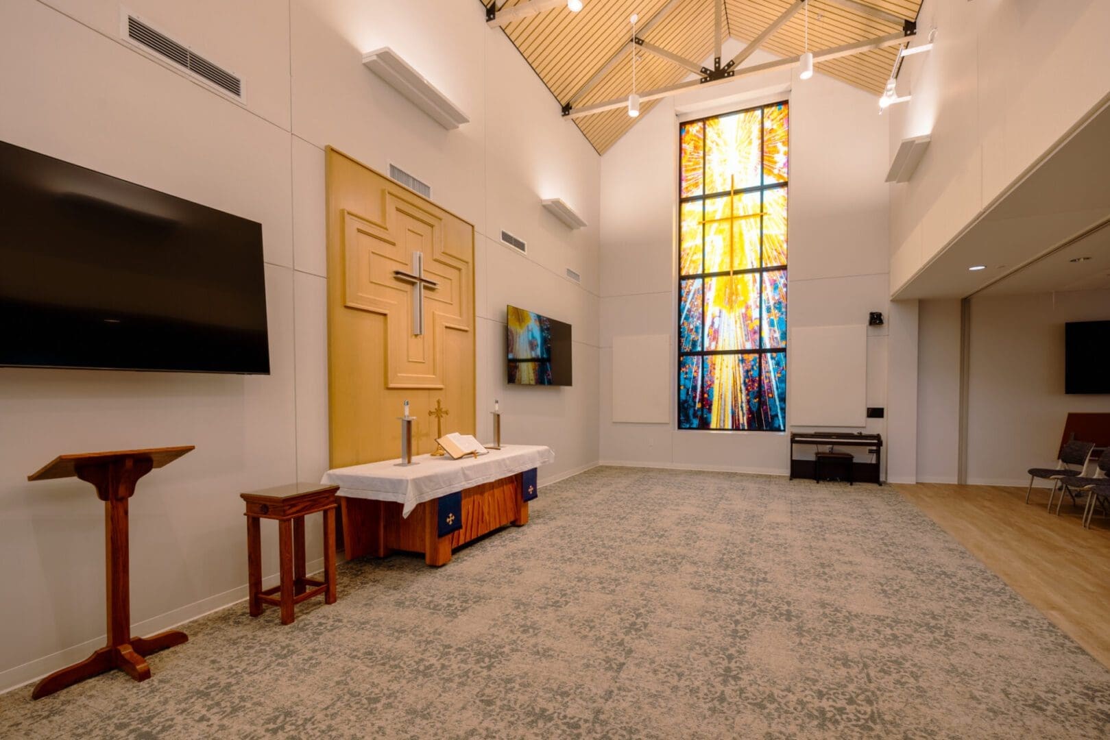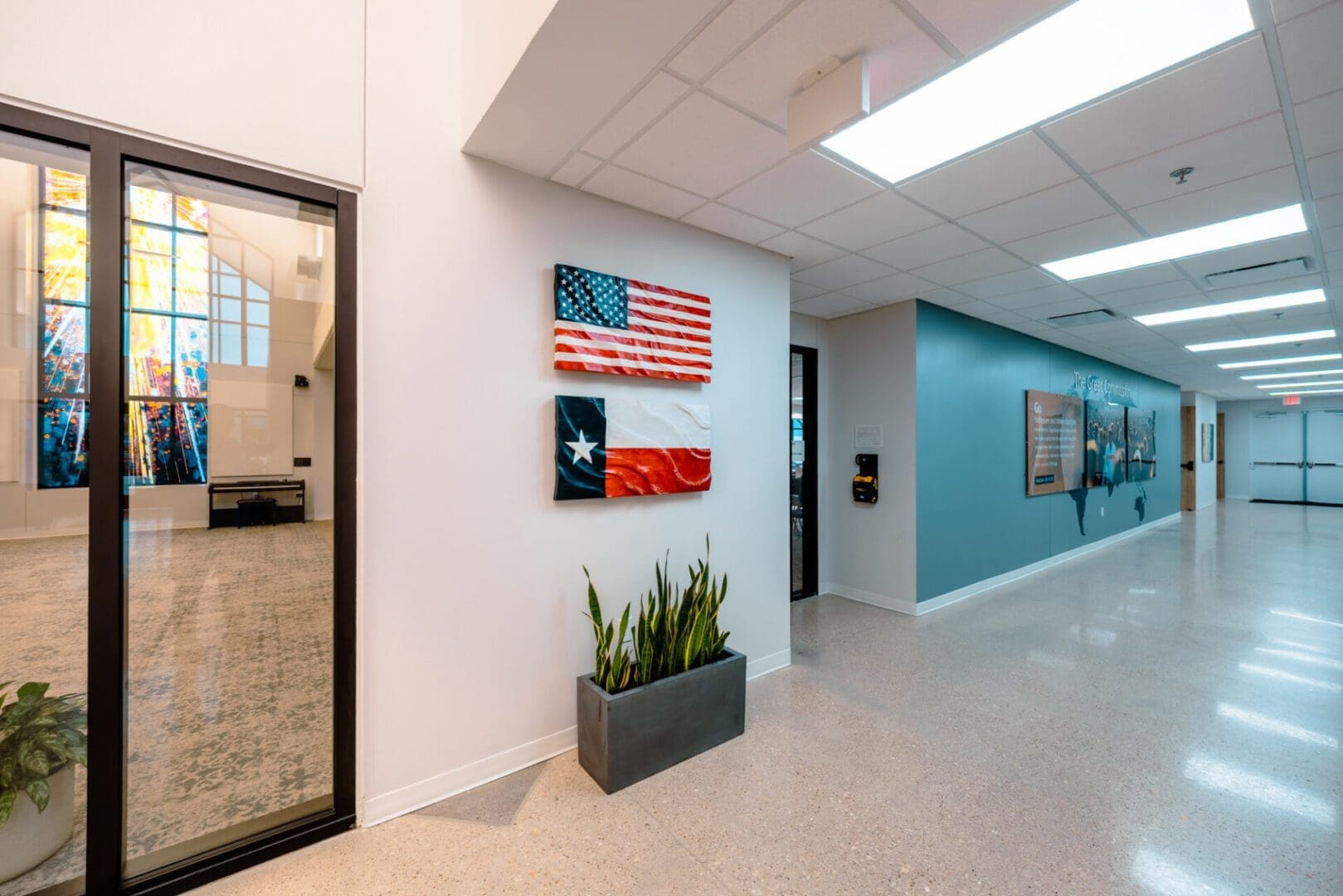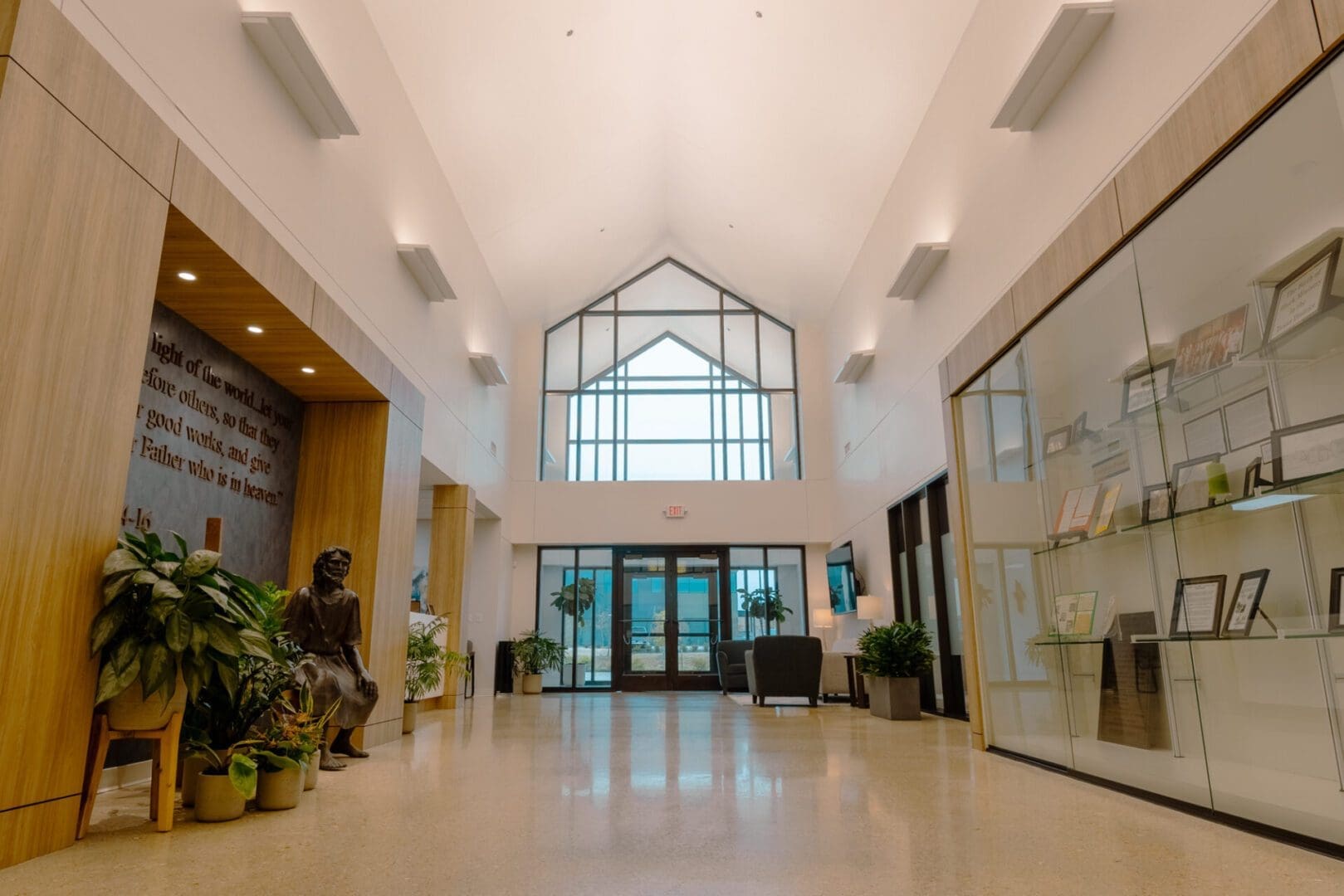 The new Texas District Mission Support Center is located in north Round Rock. The 15,000 square foot single-story structure is clad in Texas Limestone and plaster, with a standing seam metal roof and corresponding over-window canopies. The building houses three major departments within the Texas District of The Lutheran Church, and also includes a Chapel and two Large Meeting Rooms. The prominent feature of the building is a large stained glass window depicting “Christ – the Light of the World” as designed by I H S Studios of Fredericksburg.