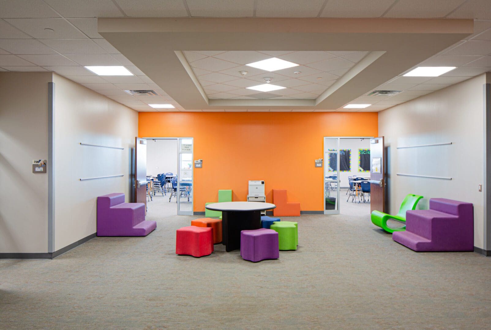 Colorful seating area with orange accent wall.