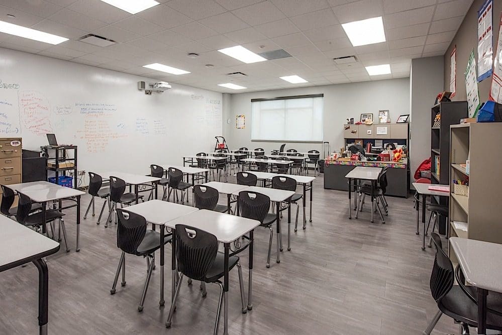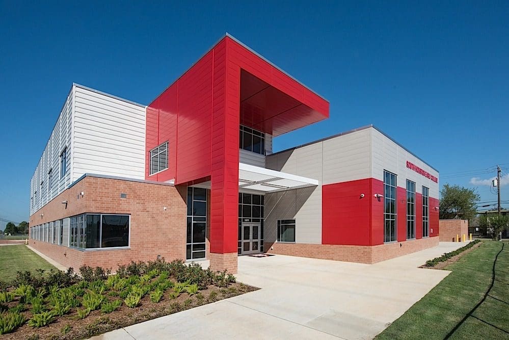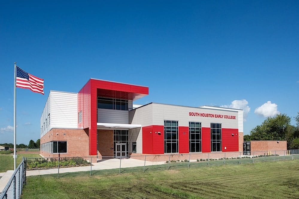 The Pasadena Independent School District’s South Houston High School Early College Annex is a new two-story structural steel building with a brick and metal panel exterior. The 29,464 square-foot facility includes classrooms, science labs, and an administration wing.