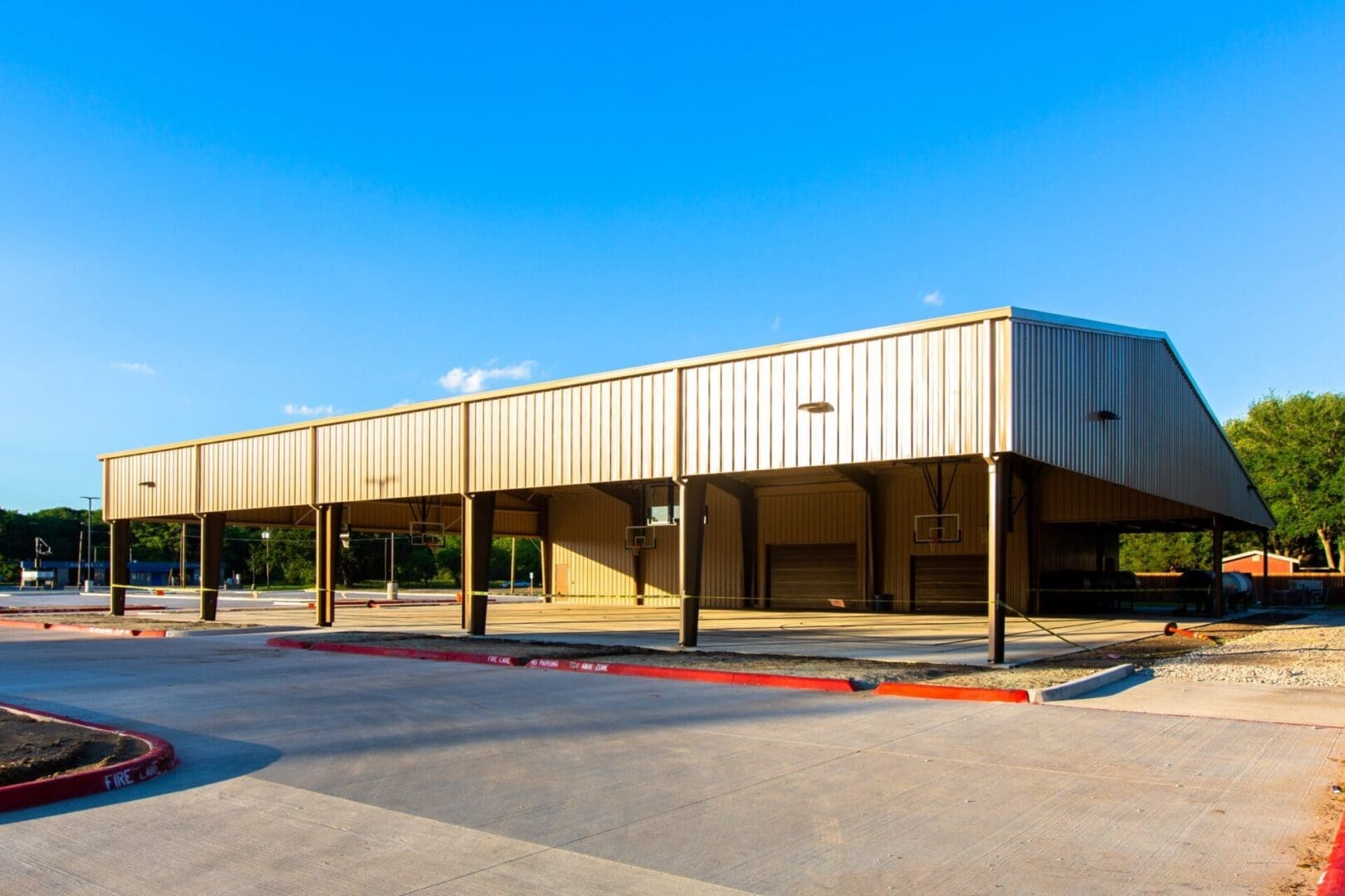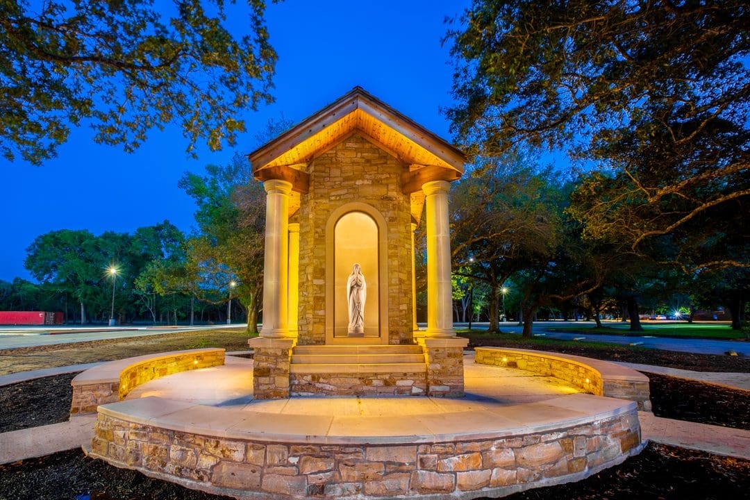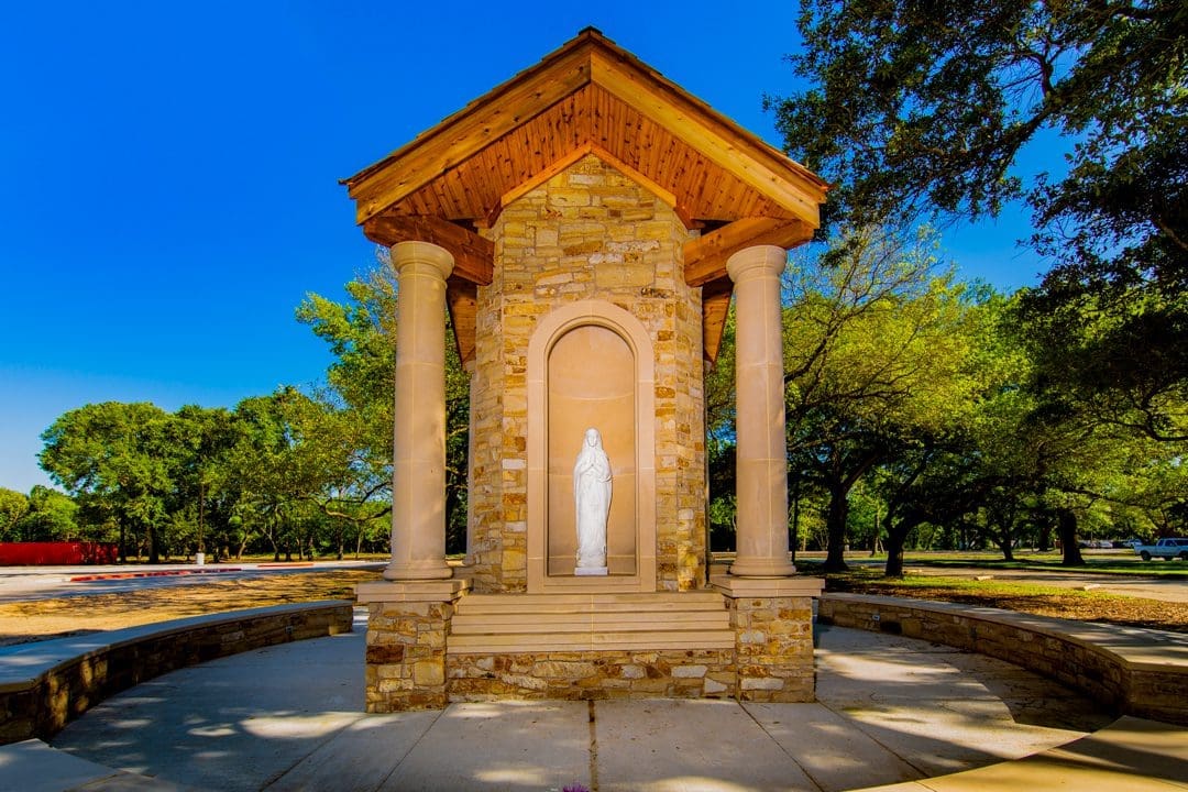 The first phase of this two-phase program includes heavy civil construction allowing for future building development. Construction included site utilities, a detention pond, and approximately 200 new parking spaces with driveways. Phase 2 consists of a new 4,700 square- foot basketball/volleyball pavilion with restrooms and storage, a new 1,250 square-foot stand-alone storage building, and a new 230 square-foot Grotto with a Rosary walk. The Grotto is wood framed with applied masonry, cast stone, and sealed cedar exposed beams.